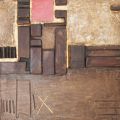 [Em mais de quarenta anos de carreira, expressa-se com originalidade e maestria na pintura (materista, quase sempre), no desenho e na gravura, como também nos objetos, esculturas e instalações, sempre com uma paleta de sofisticados tons terrosos, ouros e cobres em contraste com a composição em assemblages, dialogando simultaneamente com AntoniTápies e Kurt Schwitters.] As formas sempre são belas, nunca exuberantes, mas discretas, contidas, reflexivas para deixar fluir o timbre dos materiais: sonoridades diversas combinadas parcimoniosamente, com grande domínio técnico, mas sem as volutas de um virtuosismo exibicionista. A obra de Alcindo requer atenção, é feita para ser contemplada e não para expressar algum discurso ideológico ou metalinguístico, tão em moda numa época em que a experiência do prazer estético está fora de contexto, beleza e transcendência são palavras banidas do vocabulário crítico, mesmo porque realidades expulsas das obras da maioria de nossos contemporâneos: persecutores do “estranhamento”, que entendem como simples estranheza por desconhecer a amplitude do conceito de Chklóvski, ou talvez o próprio formalista russo.